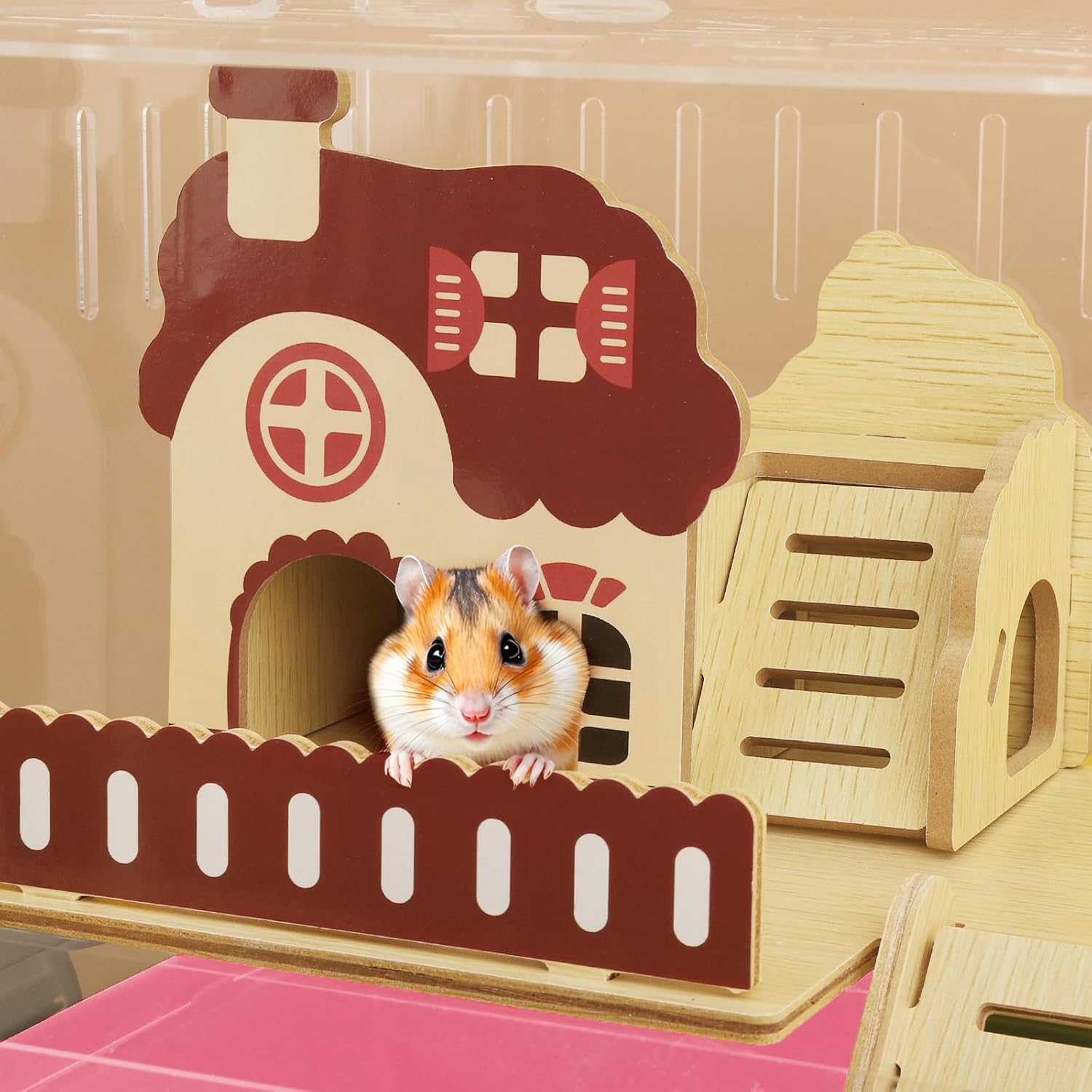 • 【Includes Accessories & Toys】This acrylic hamster cage encompasses everything needed for pet care.A wooden garden house that satisfies the hamster's instinct to dig. Inside the mice cage, you'll find a food bowl, stairs, an extra-large 18cm exercise wheel, a bridge toy, an external bathing area, and a water bottle with a steel ball to prevent leaks. This makes it an ideal gift choice, especially for children.