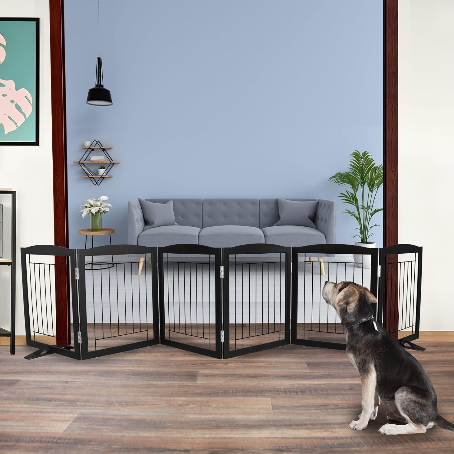 - 【Collapsible and Expandable Design】This dog gate is freestanding and can be folded into a wide Z - shape, allowing you to use it in full hallways, double gates, standard doorways, bedrooms, staircases, or any place in your house.