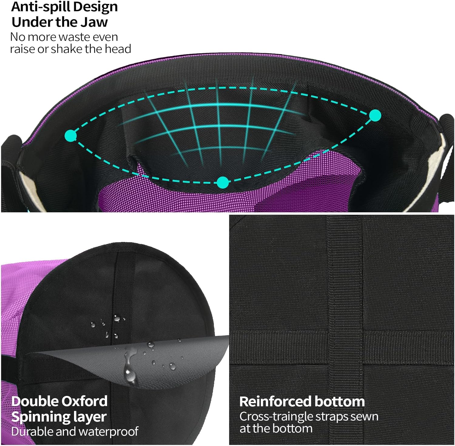 - ANTI-SPILL FLAP DESIGN: The solid flap under the jaw keeps feed in bag if horse has tendency to flip head while eating. No feed shake out even horses raising or shaking head. Save feeds that horses get the whole meal.
