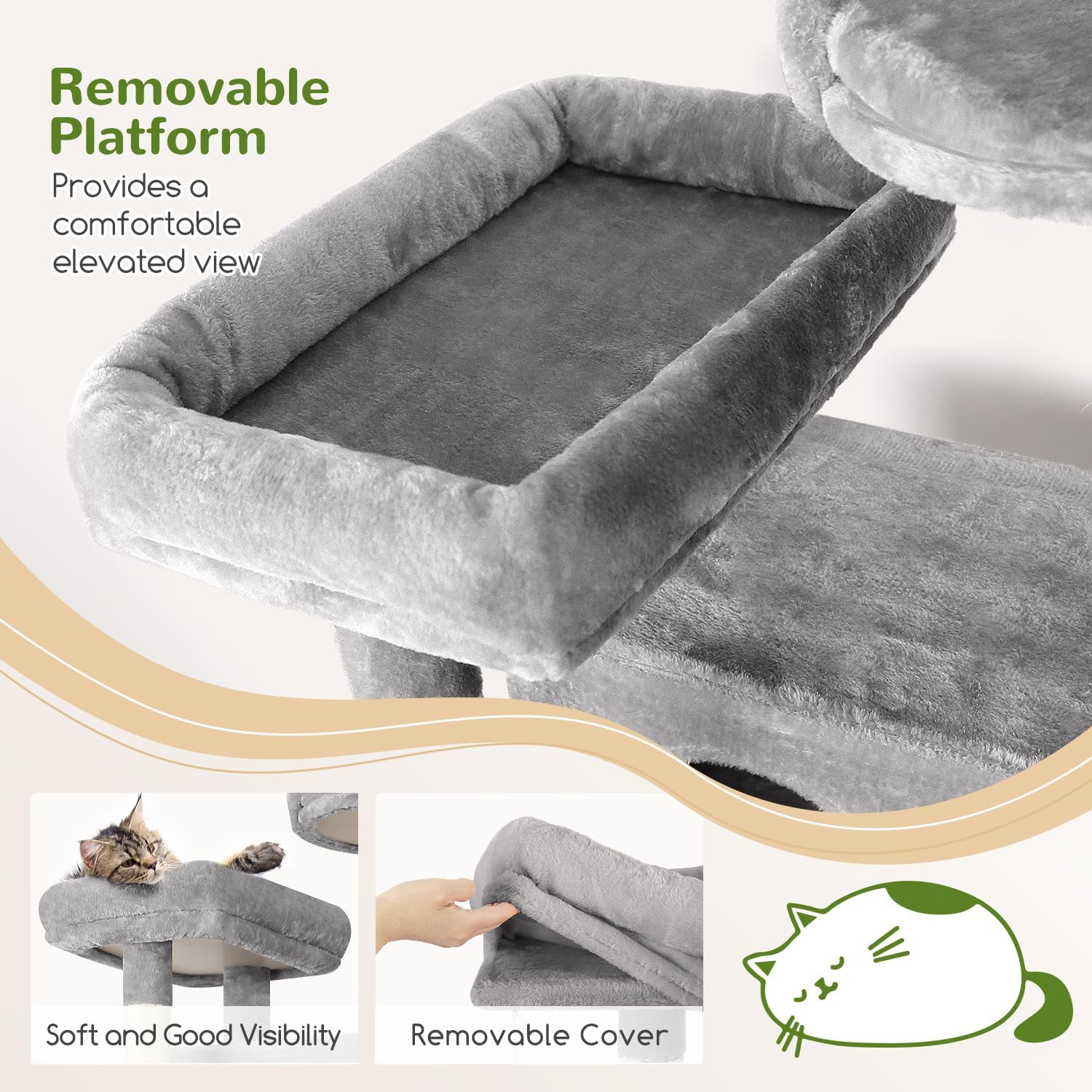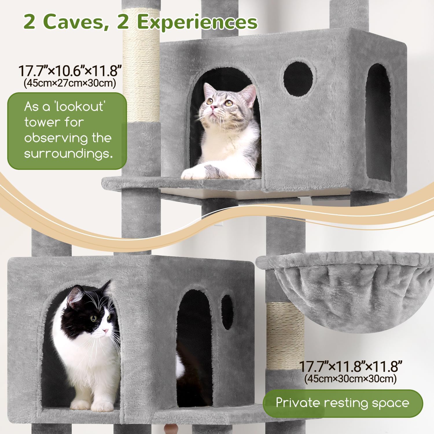 - MULTIPLE RESTING PLACES: Our tall cat tree features a enlarge platform (11.8” x 17.7”), a high point top perch and two spacious cozy cat caves, making it an excellent choice for multi-cat households. Provide ample space and multiple activity areas, allowing each cat to find its own cozy corner and enjoy the fun of playing together