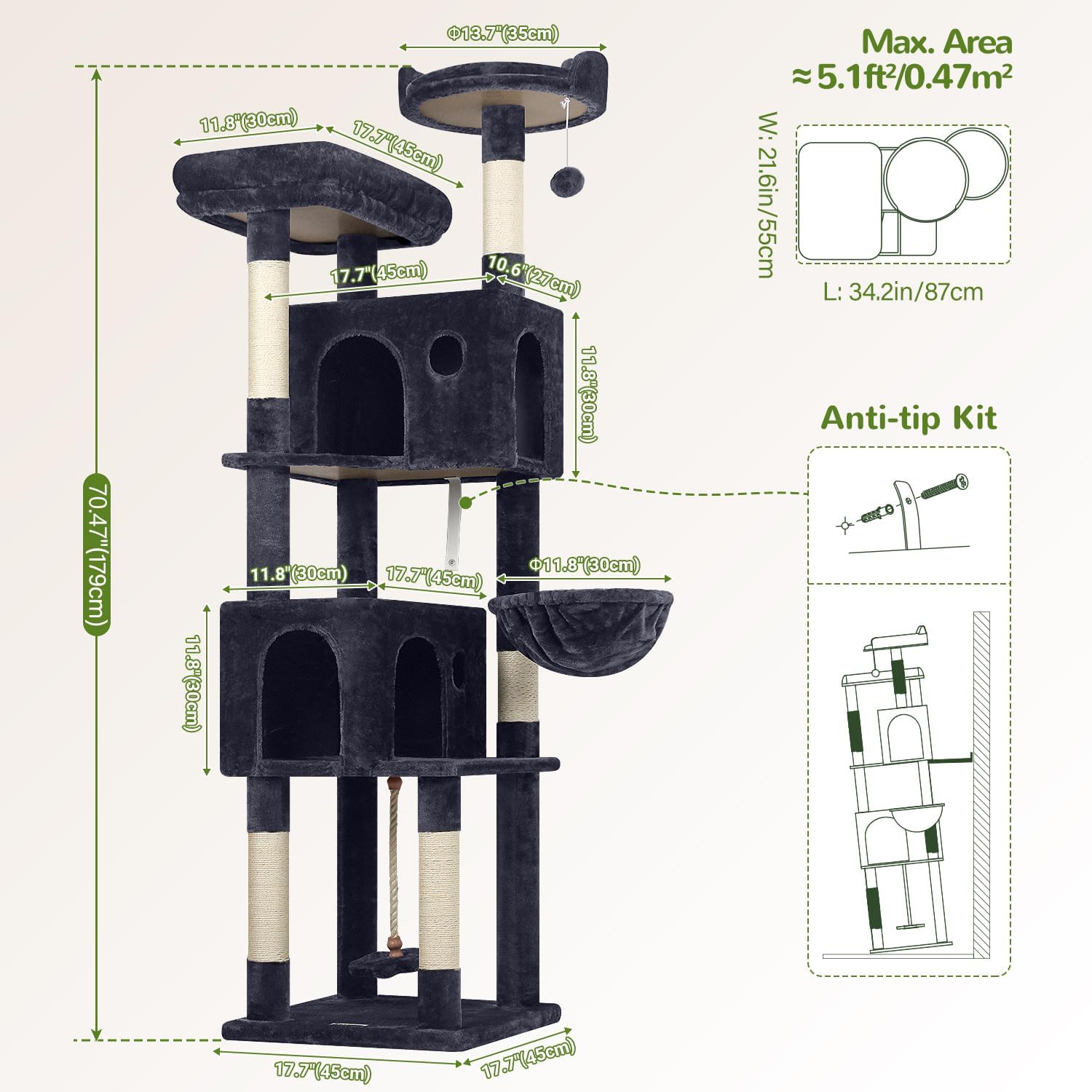 • HEIGHT: Standing at 70 inches tall, this cat tree offers ample space for climbing, meet your cat's needs for climbing, observing, and playing. Allow your cat to explore at different heights, keeping them active and curious