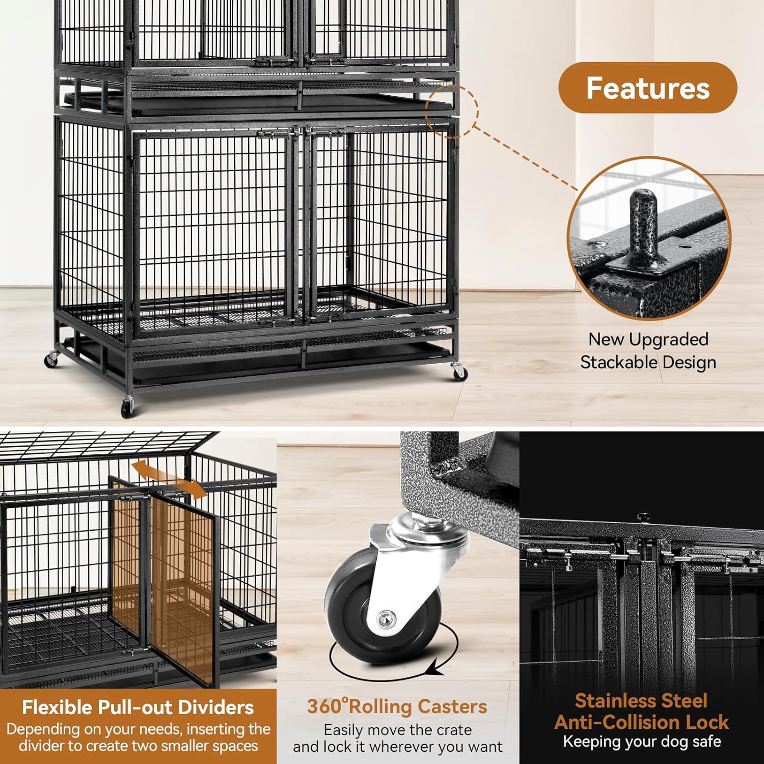 - Effortless Assembly & Quick-Clean Design:Most of the dog crate parts were pre-assembled, you just need to fit it with four wheels and six (it used to be ten) screw bolts, only takes within 5 minutes to complete. The two removable bottom pallets (a washable high grade plastic pallet and a upgrade metal pallet), make clean up more conveniently.Dog parenting can be challenging, but this crate turns those struggles into stress-free moments - your ultimate partner in creating paw-friendly routines.