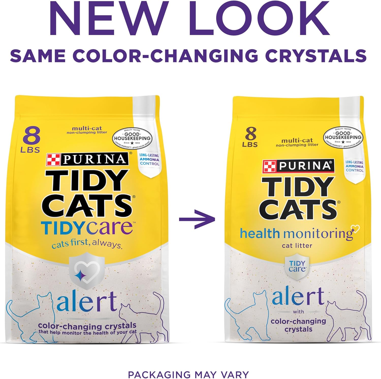 - Purina Tidy Cats Tidy Care Health Monitoring Non Clumping Cat Litter with Silica Crystals features pH detection technology that changes colors to help monitor cat health