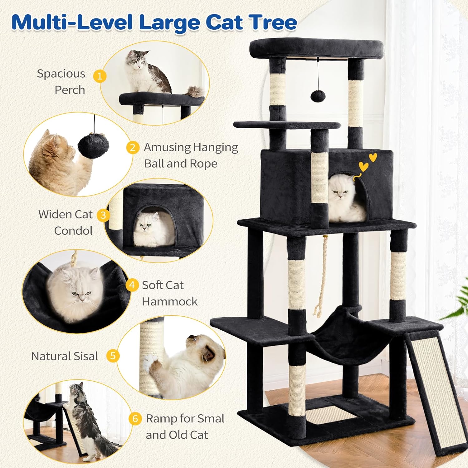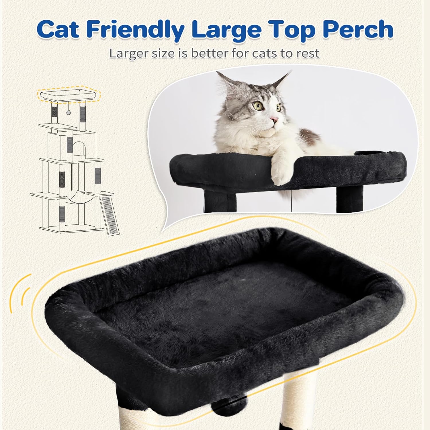 - NTERESTING LAYOUTS: Ample room and reasonable layout ensure your cat a comfortable and interesting experience. Your cute cat can hide in the condo, sleep on the lower hammock, and enjoy the scenery on the top perch. The scratching posts, a ladder, a hanging ball, and rope will bring him/her more fun