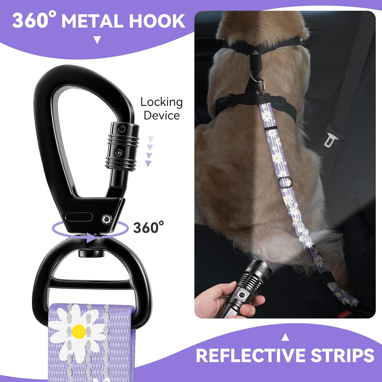 - 360° Lockable Safety Buckle: The buckle of the dog seatbelt for vehicle is designed with locking structure to prevent accidentally opened during use, so you can drive with peace of mind. 360° free rotation prevents leash tangling and knotting, allowing dog to move more freely.