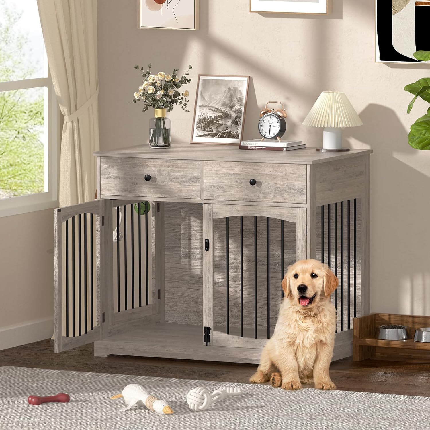 40 Inch Furniture-Style Dog Crate-Multipurpose Wood Pet Crate Furniture with Double Doors,2 Drawers, Decorative Dog House Indoor for Smal/Medium Dogs, Gray Finish