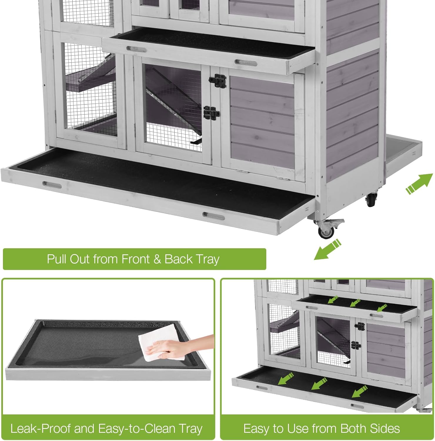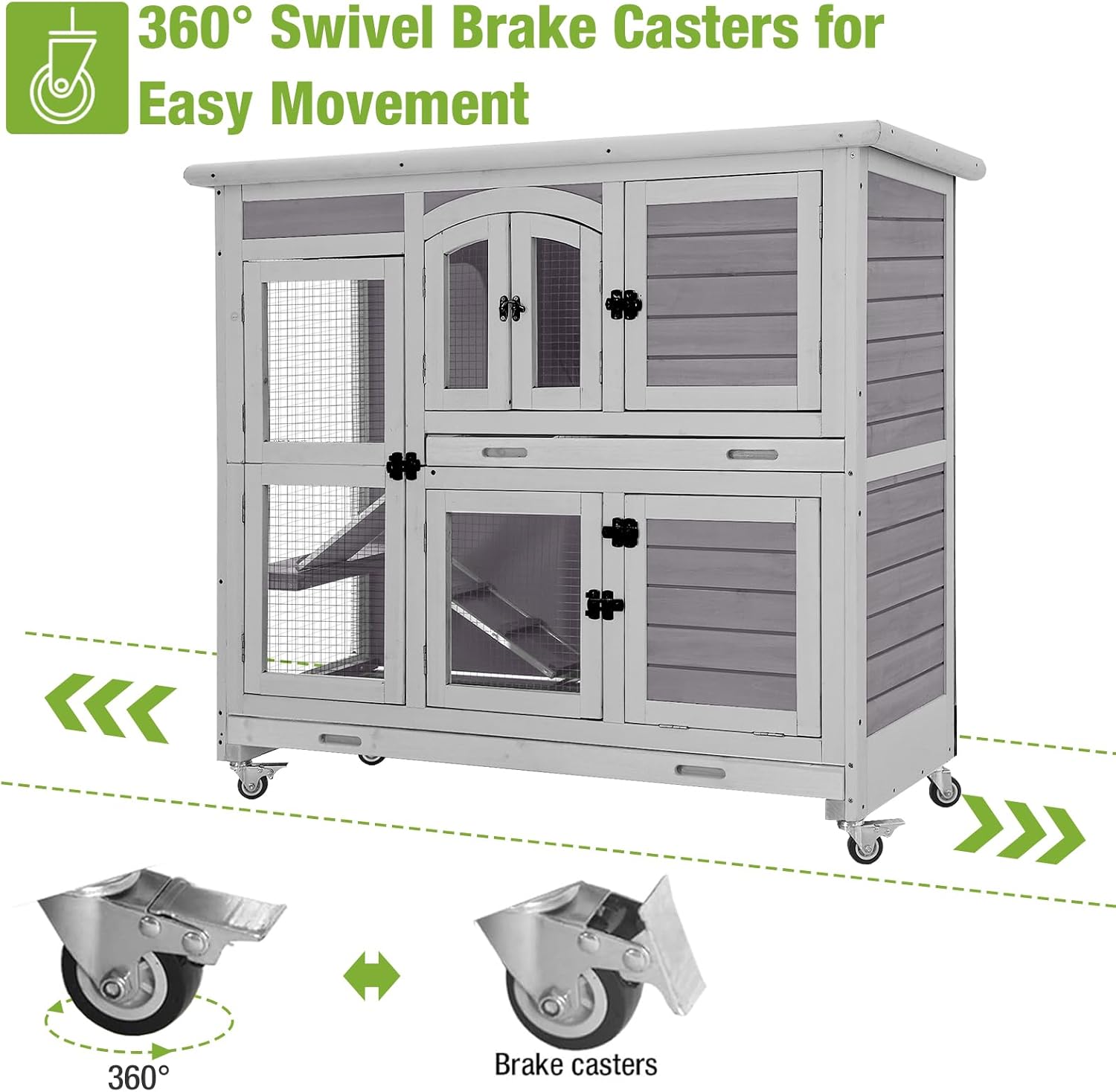 • Mobile Rabbit Hutch with Secure Casters: Four smooth-rolling casters allow easy relocation of the bunny hutch, with two lockable brakes ensuring stability and safety on any surface.