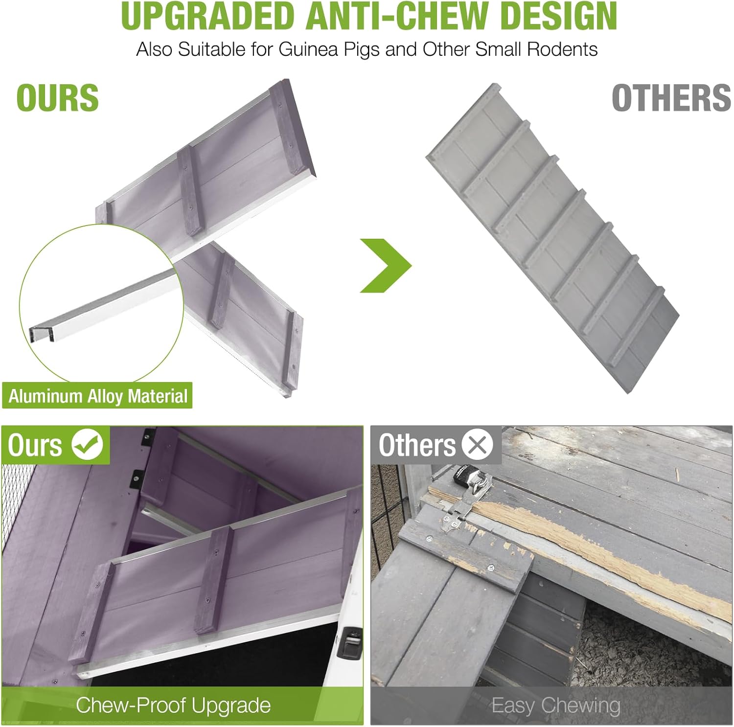 • Reinforced Chew-Resistant Design: The access ramp features aluminum alloy-reinforced edges to discourage chewing by rabbits and other small pets, enhancing the hutch’s long-term durability. This sturdy design protects against wear and tear, ensuring lasting use.
