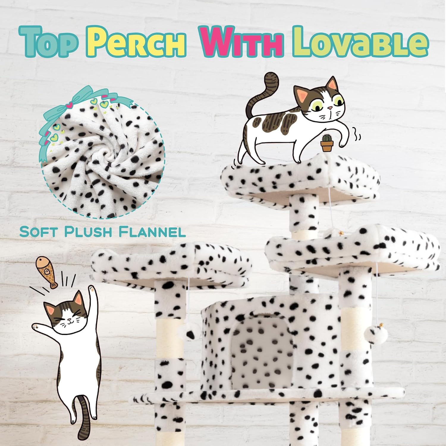 SHA CERLIN 73in Fan-Shaped Corner Cat Tower for Save Space/Multi-Level Tall Tree for Indoor Kitties/Condo with Baskets/Cozy Perches/Sisal Scratching Posts/Pet Activity House/White & Black Spot