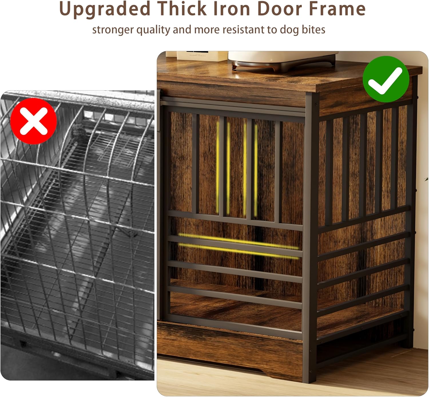 • 【Reliable, Safe & Interactive】Double dog crate crafted with high-quality metal bars and sturdy wood panels, this dog crate ensures both durability and interaction. The reinforced wood frame and robust steel tubing can support up to 300 lbs, offering exceptional stability and chew resistance compared to typical crates. The bar spacing allows you to easily check on, feed, or comfort your dogs without opening the door, providing safety while keeping pets engaged and connected with family life.