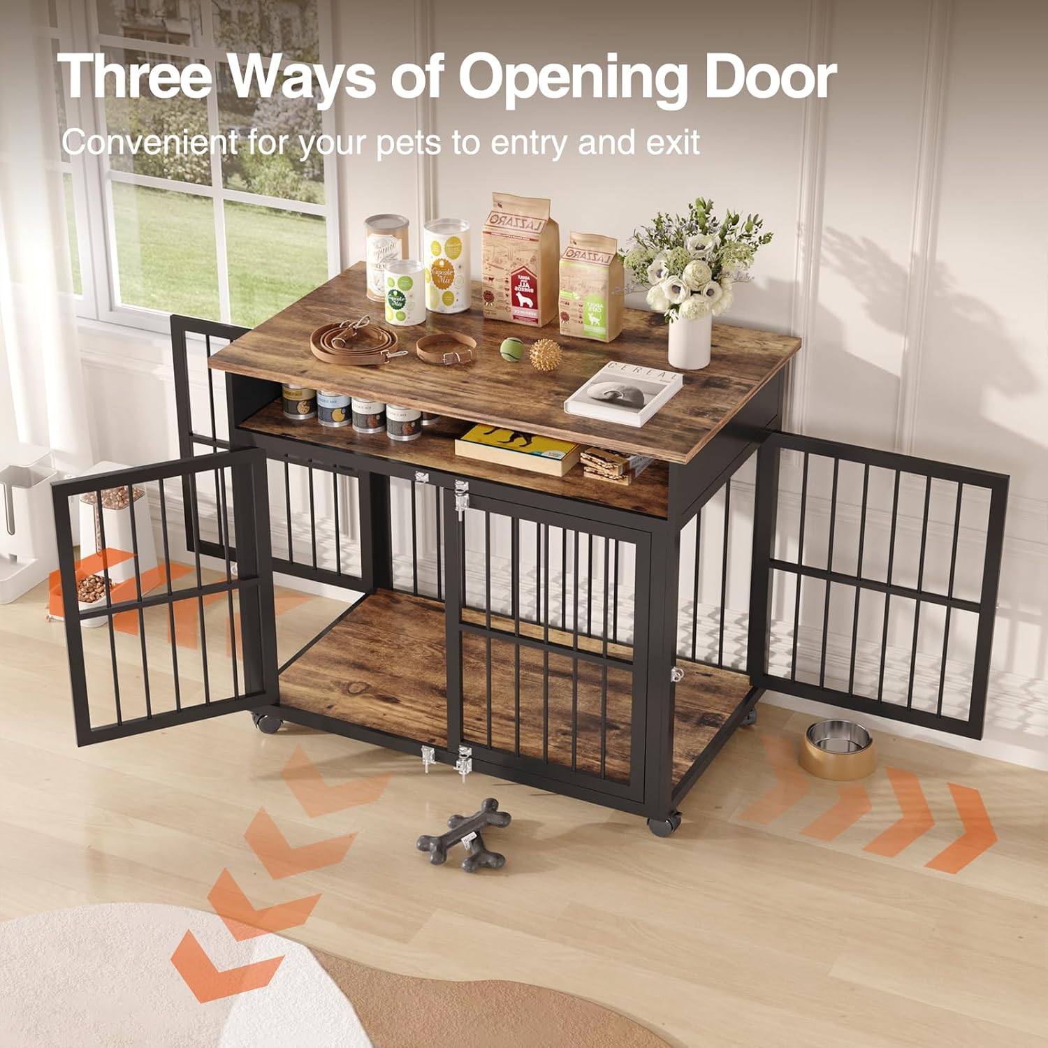 • Furniture-Style Dog Kennel:With a storage shlef, it serves as both a stylish dog crate and a practical side table. It provides space to store dog supplies and decorate your house at the same time! Equipped with 360° lockable wheels, you can easily move it around your house for different needs.