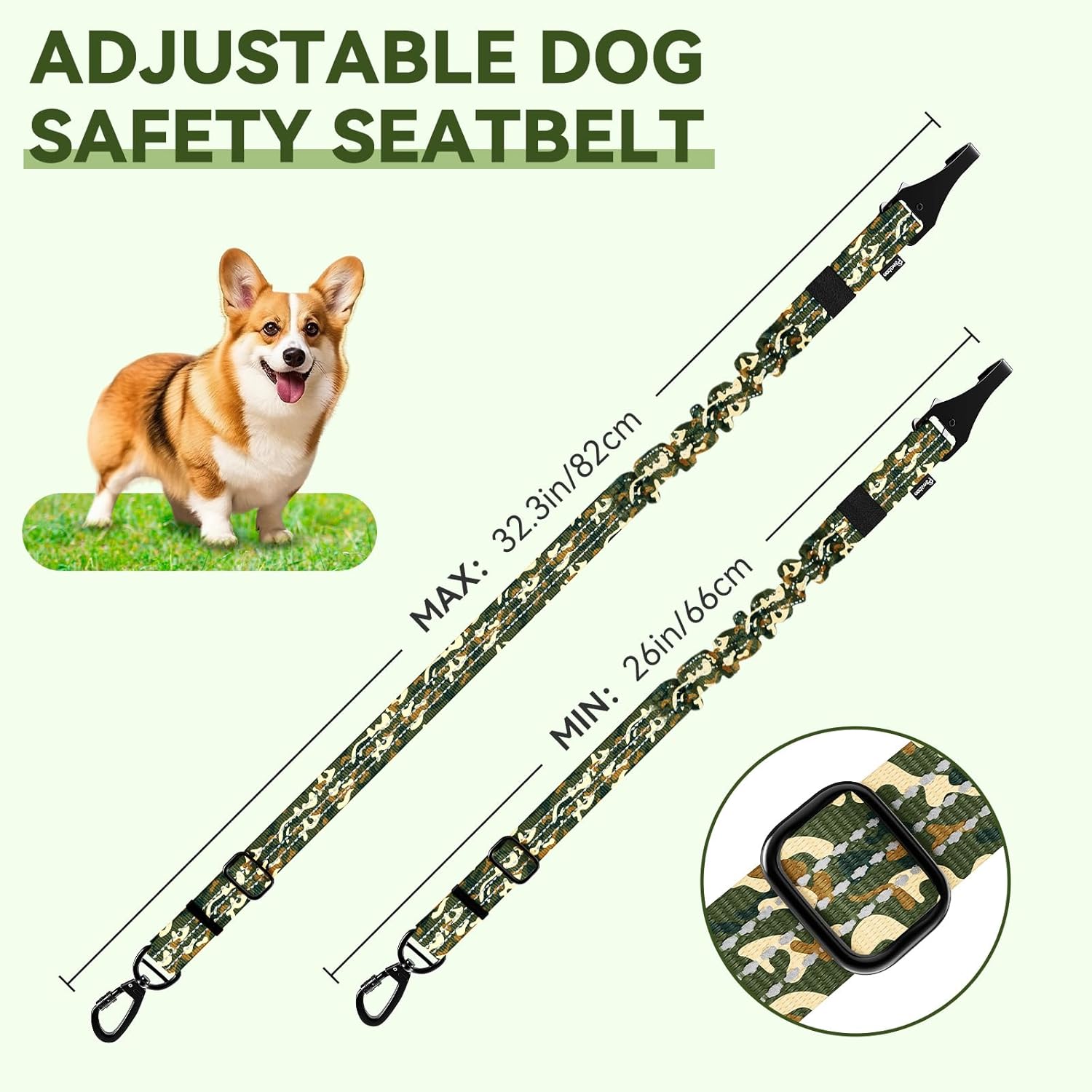 - Adjustable Pet Leash for Car: The dog car leash strap can be adjusted to maximum length (with elastic cord stretch): 32.3in/82cm, and minimum (without elastic cord stretch): 26in/66cm, you can adjust it to a comfortable length according to your pet's size, making furry dog enjoy the journey.