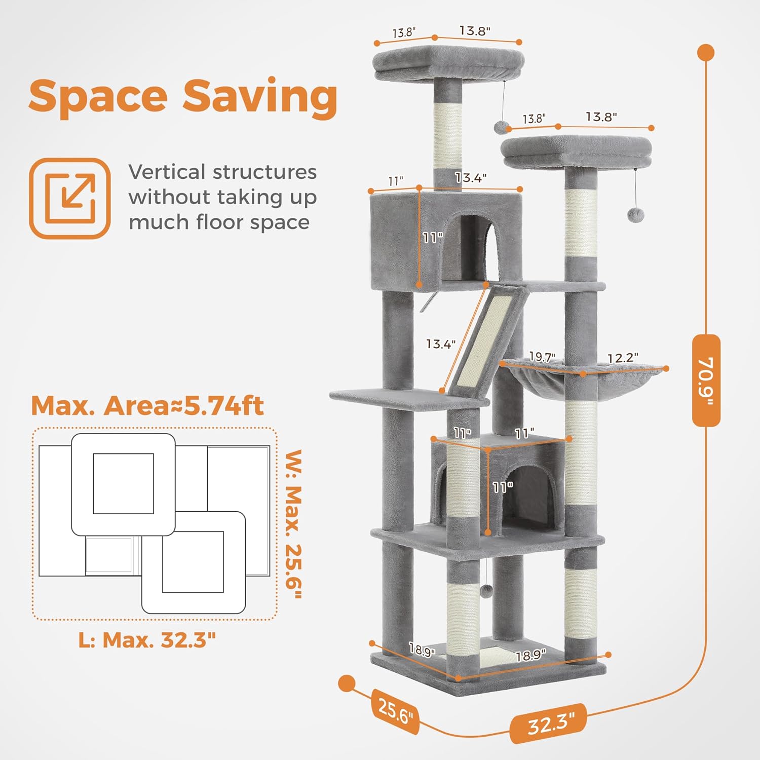- Ultimate Feline Comfort:This tall cat tree features two large, plush condos (size) and a basket (size) that serve as the perfect retreat for your cat’s relaxation and play and offer a quiet, private space. While 2 wide perches (size) serve as sunbathing zones offering 360° birdwatching views.