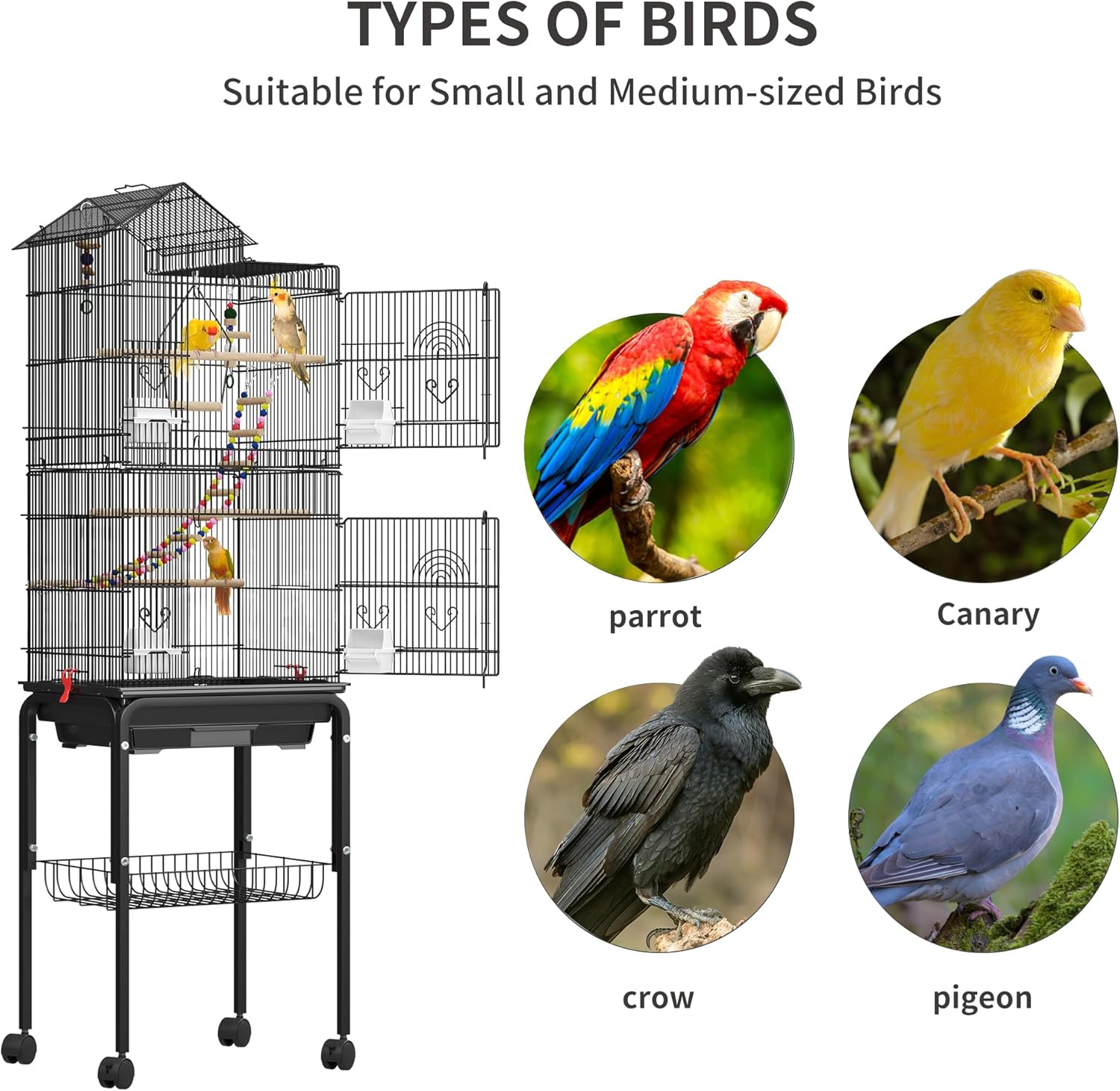 - Mobility & Storage Solution: 4 smooth-rolling 360° wheels with locks allow easy relocation. The bottom storage shelf offers organized space for bird supplies. Sturdy construction with reinforced corners ensures stability during movement