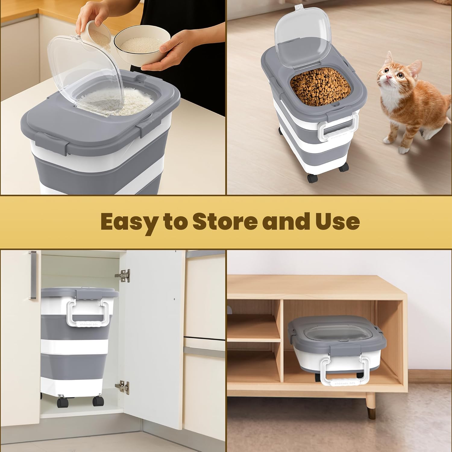 - Collapsible & Large Great Capacity: This large dog food storage container can hold 30-40 lbs of rice or 25-28lbs of pet food.Unfolded size: 17"L x 10.5"W x 14"H,, suitable for storing 20lb dog food /40lb rice. Folded size:17''Lx10.5''W x5.5''H,suitable for storing 6lb dog food /15lb rice.. Collapsible design makes it saving space.Note: Due to the variation in coarse particle size, the container capacity may vary.