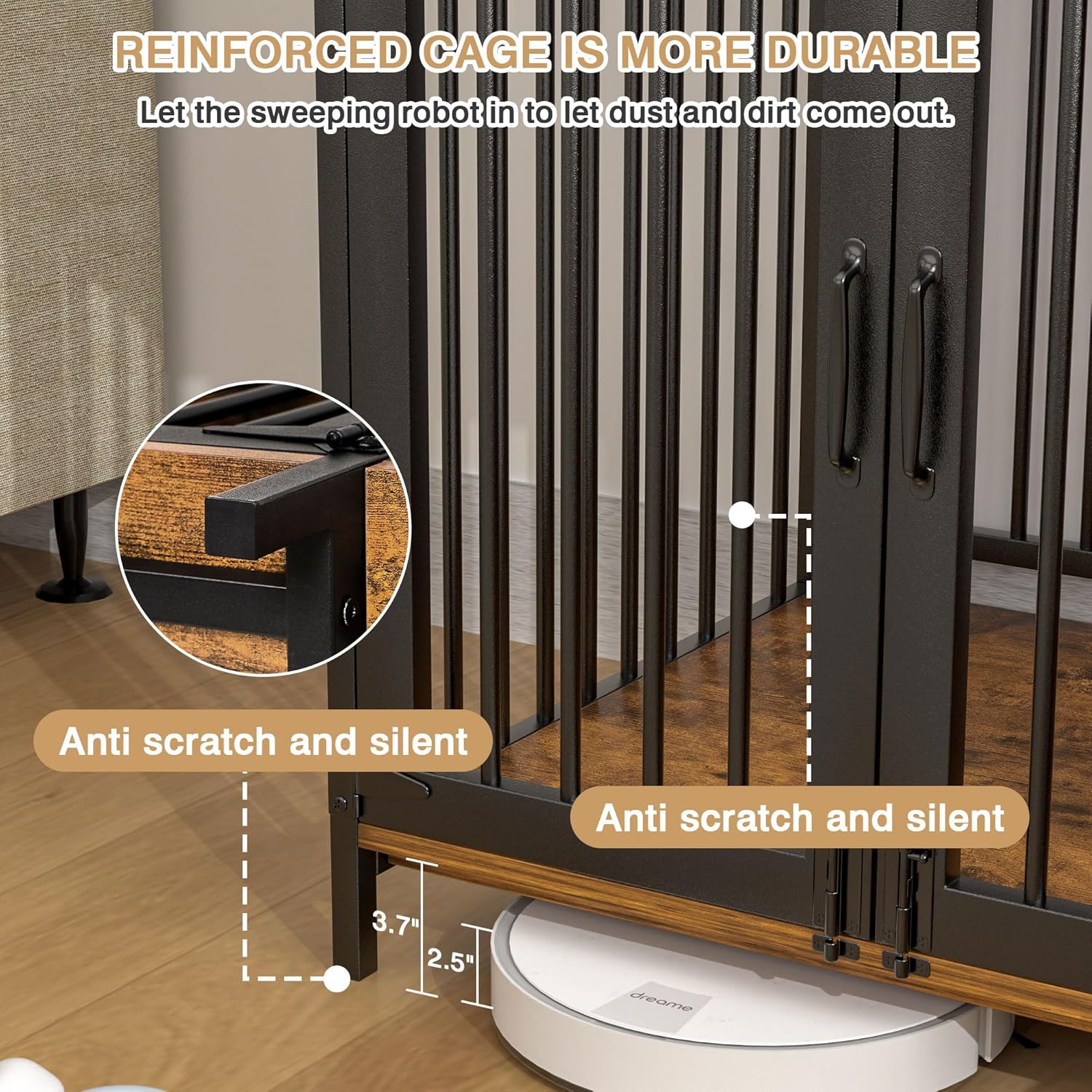 - Extra-Large Burnt Wood Top: Spacious 43.31" tabletop in rustic burnt wood finish holds up to 150 lbs—this dog cage furniture is ideal for placing décor, storage bins, or daily essentials within reach.