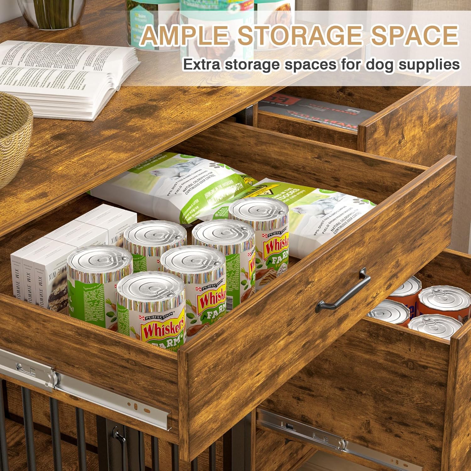 - Ample Storage Space: Comes with a top full-length drawer and three side drawers—two large, one smaller—ideal for organizing dog kennel indoor supplies, pet toys, treats, leashes, grooming tools, and more.