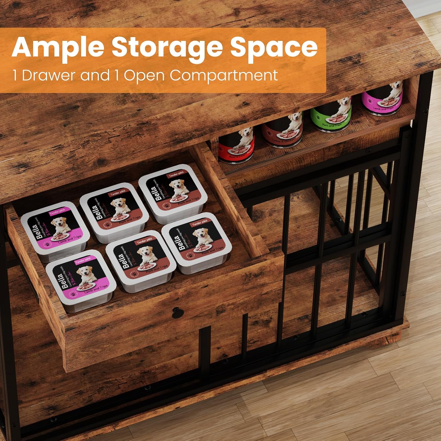 - Ample Storage Space: The dog kennel furniture has desktop can hold plenty of items or display decorations. One drawer and one open shelves, providing plenty of space for storing pet supplies and household items, and it can help your home become more organized