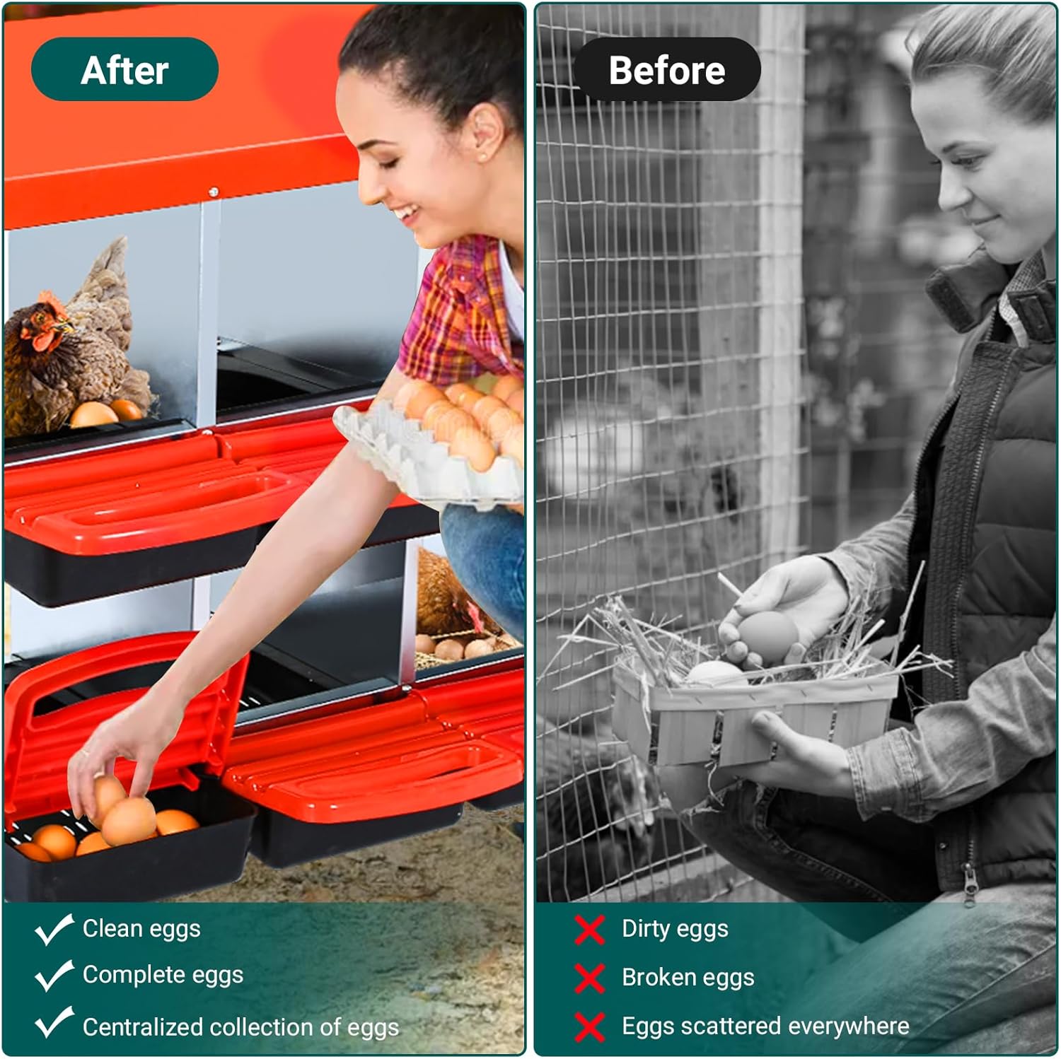 - CONVENIENT EGG COLLECTION MECHANISM: The unique tilting design of this nesting box allows the eggs to roll automatically into the collection tray for quick and easy egg collection. Say goodbye to tedious manual egg picking, you can easily access fresh eggs while ensuring they are intact.