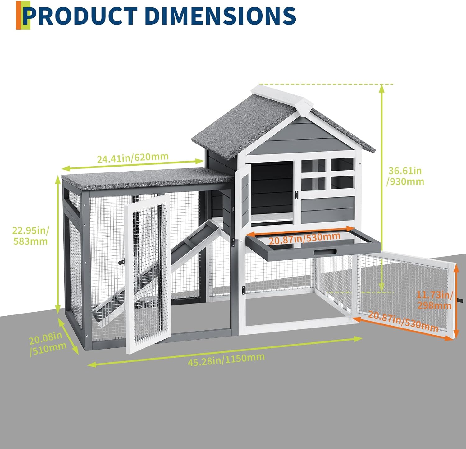 - [Spacious Double-Decker Design] This Double-Decker Rabbit Hutch Measures 45 Inches Long X 20 Inches Wide X 36 Inches High And Offers Separate Play Areas: A Sunny Ground-Level Play Area And A Waterproof Elevated Sleeping Area.