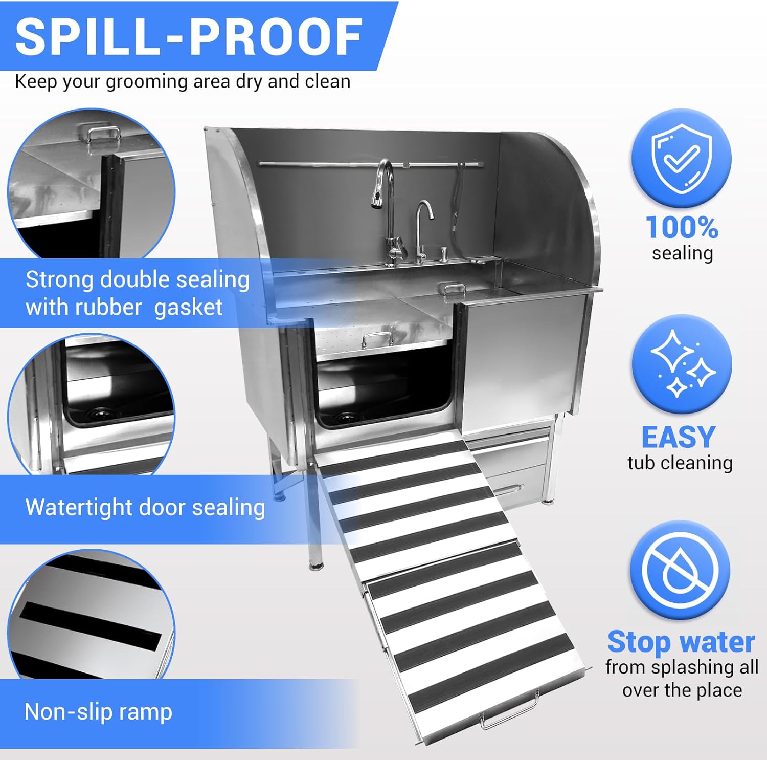 - Spacious Tub with Smart Storage: 50”x30.7”x58.7” size fits all dog breeds. Includes a large sliding drawer to organize towels, shampoos, and grooming tools for a clutter-free bathing area.