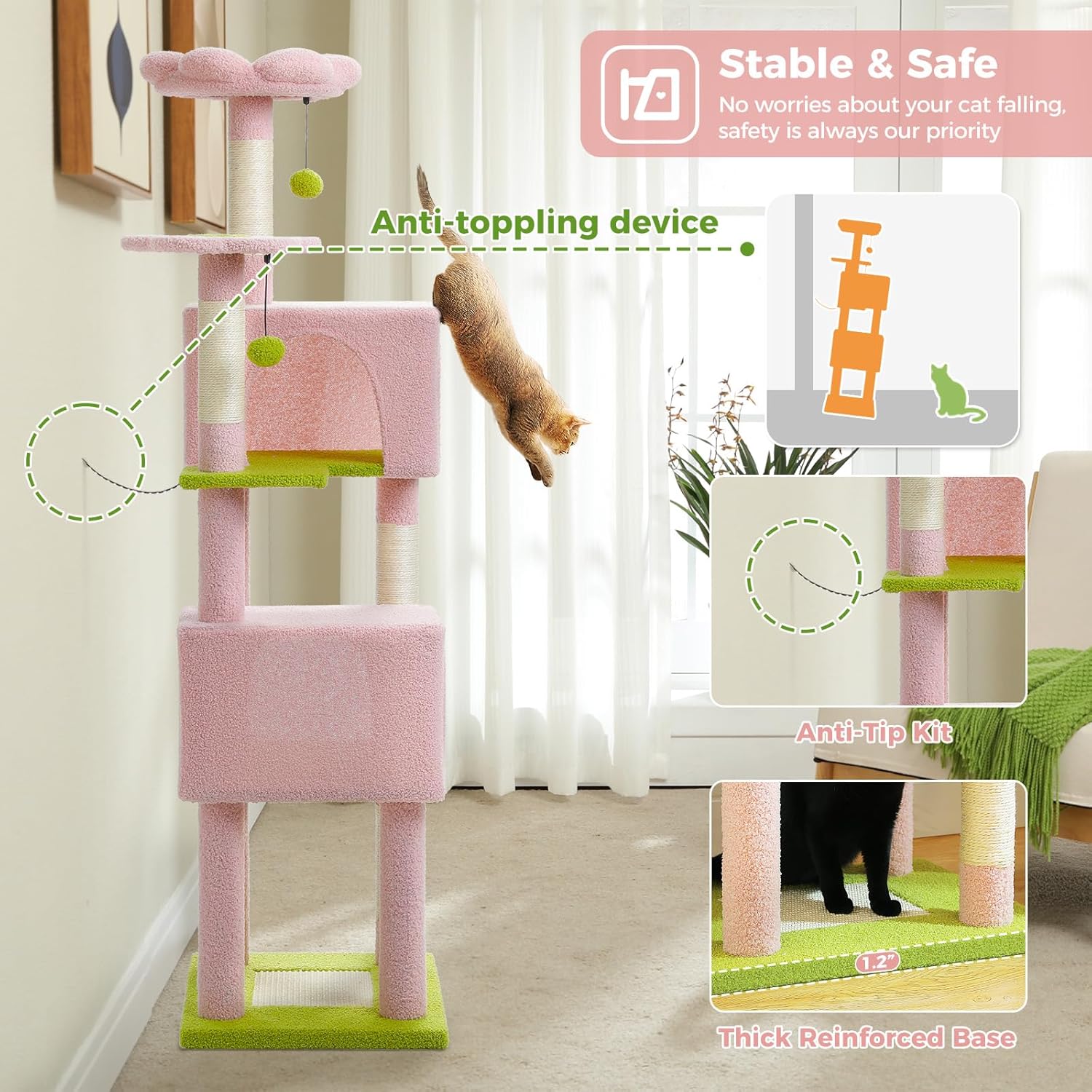 - Flower Cat Tree Design: With a flower-shaped top perch and refreshing pink and green tones, this flower cat tower blends cuteness and function. It features scratching posts, a sisal pad, cozy condos, and hanging pompoms—an all-in-one spot for climbing, scratching, and lounging.