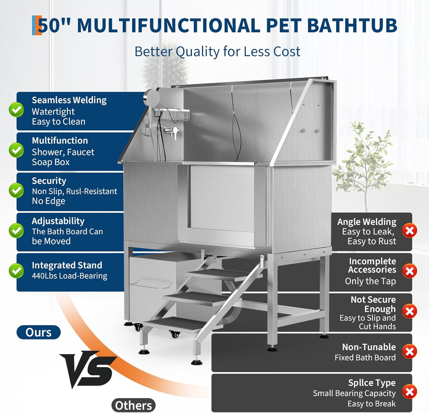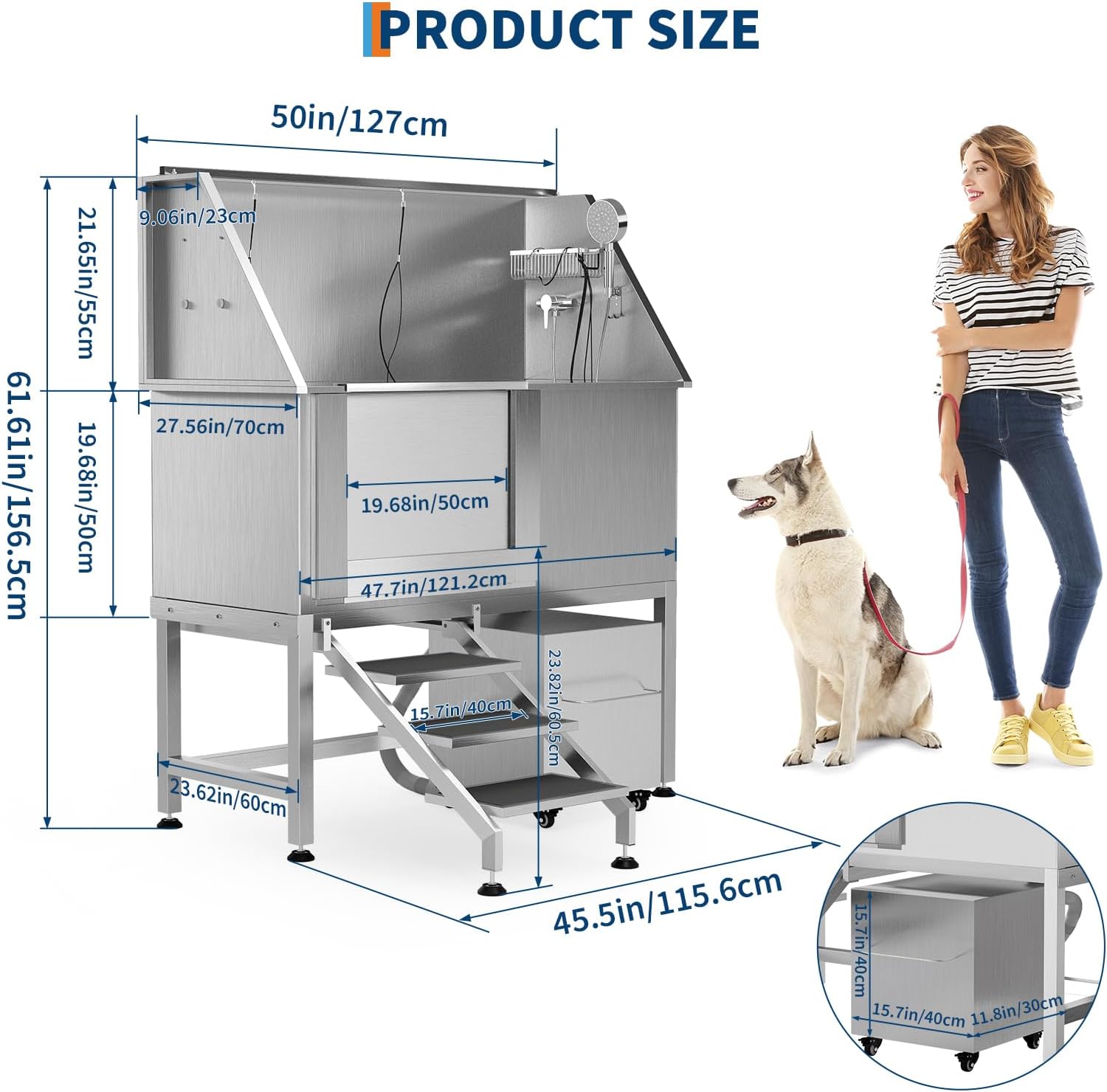• Efficient Drainage System Removable floor grate prevents water accumulation and simplifies post-bath cleanup. Maintains tidy workspace during grooming sessions.