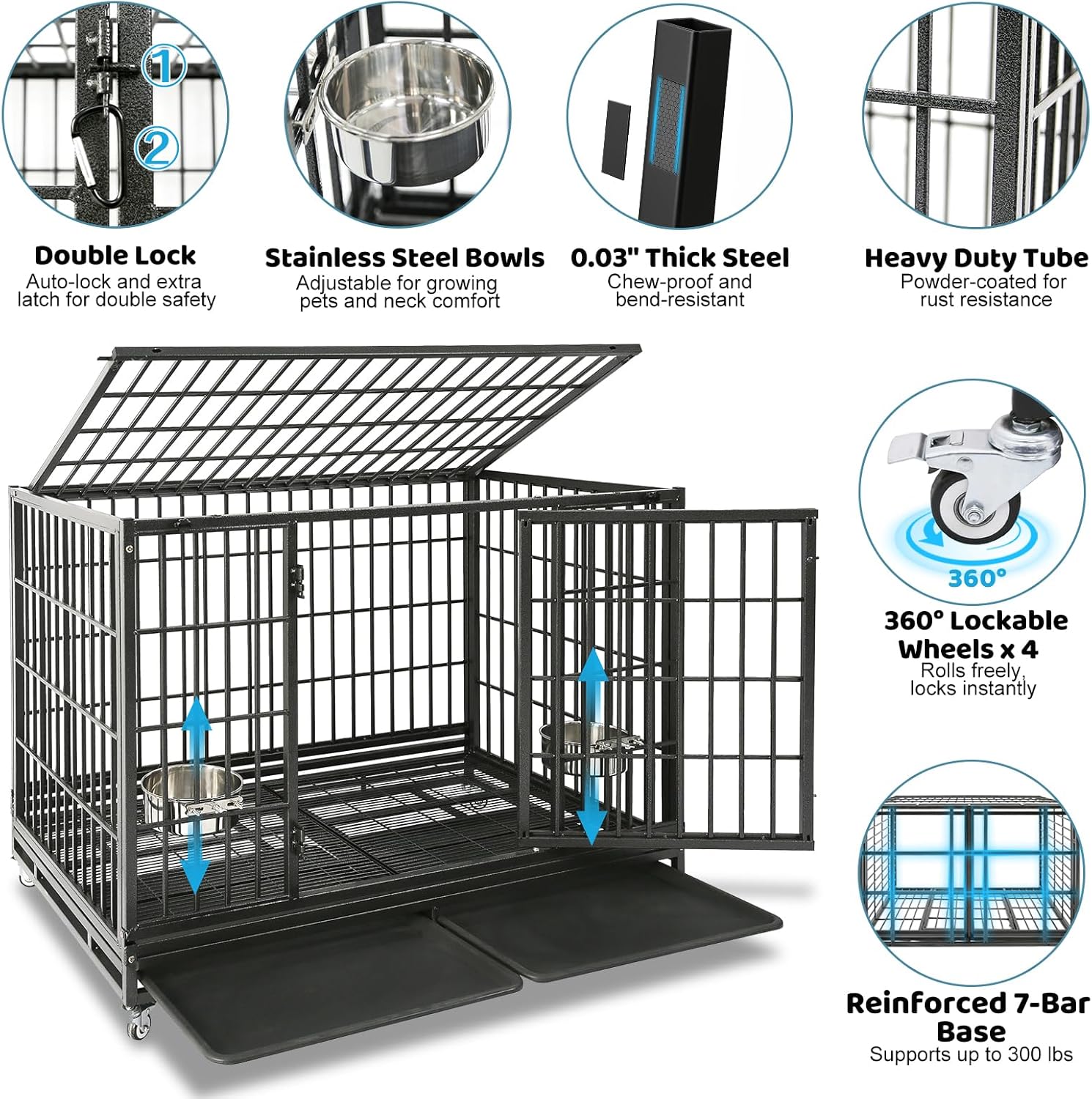 - Durable and Strong Structure: Made with reinforced steel tubing, this dog cage large dogs features a 0.03" metal thickness for maximum durability. Even dogs with high separation anxiety, intelligence, or aggression can't knock it over or damage it. With 7 reinforced steel bars, it can support up to 300 lbs. The powder-coated finish offers rust and corrosion protection, ideal for outdoor use